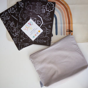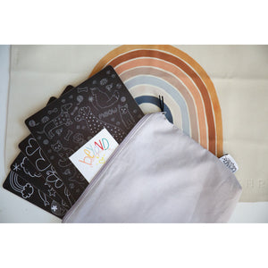Measuring 9" x 12", our new double lined, fabric bags were created to allow you to bring your mini mats on the go! Add your kiddos board and chalk crayons to a convenient bag to avoid the mess and hassle. The best part is they are also machine washable!