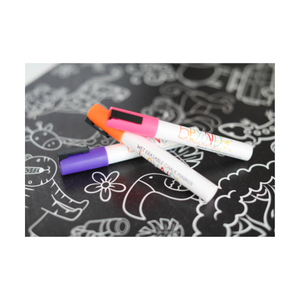 • It is possible you may find streaks from the chalk markers on your board or colouring mat if you leave the ink on for too long. We have found that orange + lemon essential oils work like magic to remove lines! If you do not have these try some rubbing alcohol or olive oil!