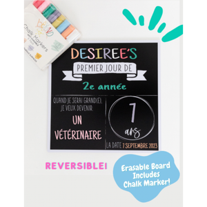 For First & Last Day Photo's! With its durable material and erasable chalk marker, you can write on your board and easily wipe off to reuse next year! Say goodbye to the days of wasting paper and money - this super fun board is sure to make a statement on your first and last days of school photos!