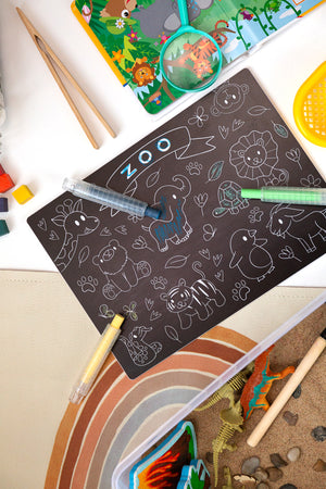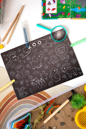 • It is possible you may find streaks from the chalk markers on your board or colouring mat if you leave the ink on for too long. We have found that orange + lemon essential oils work like magic to remove lines! If you do not have these try some rubbing alcohol or olive oil!