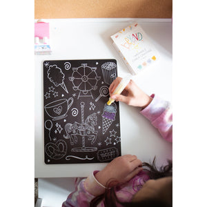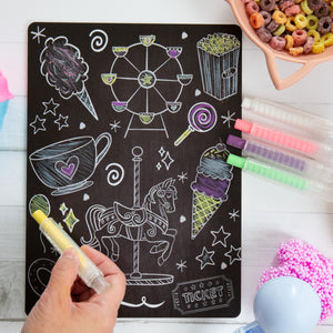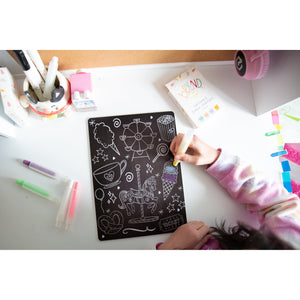 • It is possible you may find streaks from the chalk markers on your board or colouring mat if you leave the ink on for too long. We have found that orange + lemon essential oils work like magic to remove lines! If you do not have these try some rubbing alcohol or olive oil!